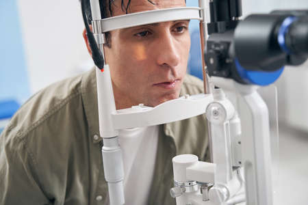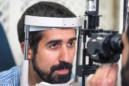 Eye examination in a medical clinic during daylight with a focused professional using a slit lamp