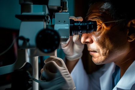 A dedicated healthcare professional conducts a meticulous eye examination, focusing intently on the patient