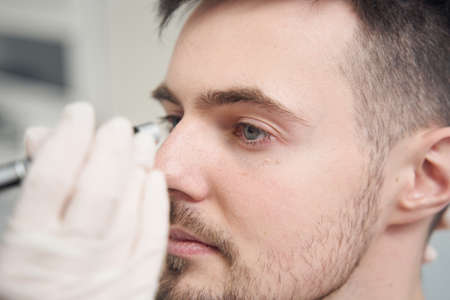 Ophthalmologist using special ruler tool to measure the distance between the eyes of patient
