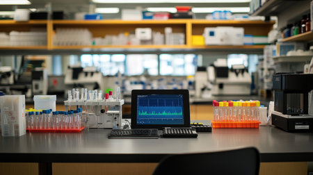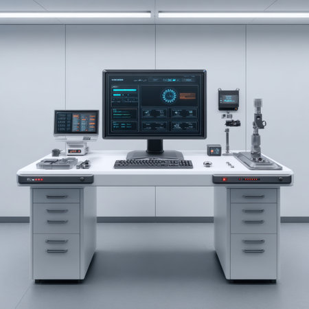 A modern laboratory workspace featuring advanced technology, including a sleek workstation with a computer screen, monitoring tools, and precision instruments, designed for scientific research and data analysis.