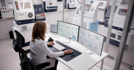 A person sits at a desk, engaging with multiple monitors displaying intricate visual data in a contemporary office setting, showcasing innovation.