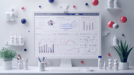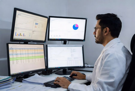 A focused medical professional analyzes critical healthcare data on multiple screens, showcasing intricate charts and graphs in a modern clinical environment.