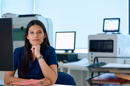 Healthcare professional working in an office during daytime, focused on computer tasks and preparing documents with modern equipment nearby