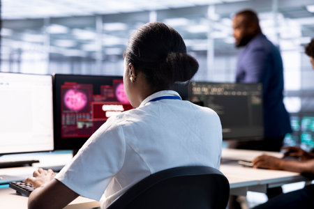 Server farm IT professional trying to protect hardware from hacker attack stealing info. Woman in data center trying to get rid of virus after seeing security breach alert on display