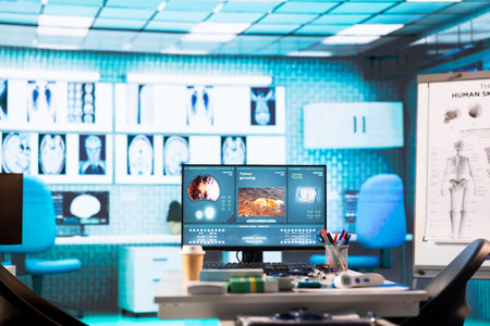 Empty hospital cabinet with instruments and gadgets set up for consultations, a modern software used for scan interpretation and patient care. Medical clinic within the health industry.