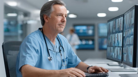 A healthcare professional in scrubs focuses intently on multiple computer screens in a clinical setting, illustrating the role of technology in modern medical practice.