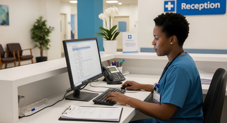 Receptionist typing on a computer at a desk with phones and a stethoscope, checking patient records