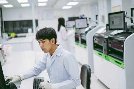 young male scientist looking results from automation blood analyzer report in computer and young female scientist working with automation blood analyzer at medical laboratory