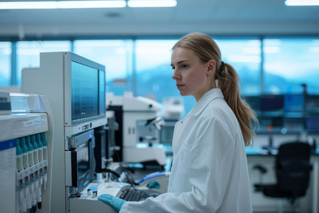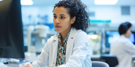 Focused Female Scientist Analyzing Data on Computer in Laboratory