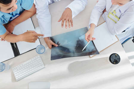 Group of medical workers pointing at chest x-ray and discussing possibility of terminal disease