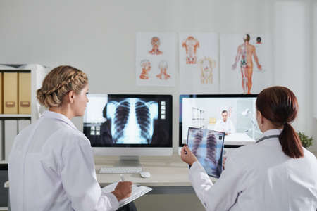 Two female doctors looking at x-ray pictures of lungs in modern clinic. healthcare