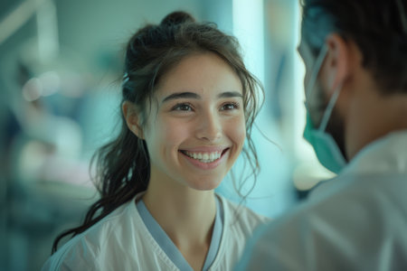 Portrait of a smiling female patient in a clinical setting with a soft focus background