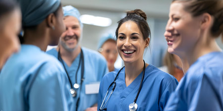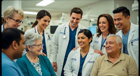 A diverse group of smiling medical professionals, including doctors and nurses, gathered around a patient in a bright hospital setting, conveying a sense of care and compassion.