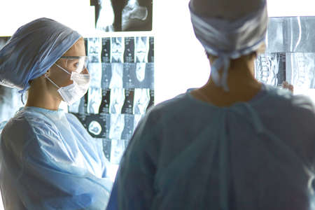 Doctor and nurse in uniform look and discuss an X-ray or MRI scan of the patient spine