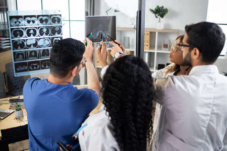 Back view of multiethnic male and female doctors discussing brain CT scans in modern hospital. Two colleagues look and discuss an X-ray or MRI scan of the patient