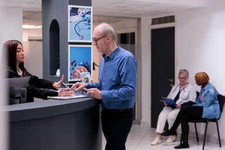 Adult using credit card to pay consultation and prescription tretment at facility reception counter with receptionist. Senior person paying for examination appointment in waiting area lobby.