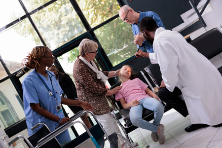 Little girl faints and collapses on the chair in hospital reception during medical examination, worried grandparents trying to help. Practitioner doctor consulting child trying to wake up her