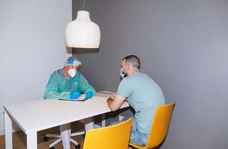 Doctor with face mask and shield attending to the patient in the consultation room and taking notes
