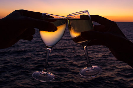 Hand holding glass of wine over the sea. Chin-chin. Romantic vacation. Two hands holding wine glasses against the sea. Copy space