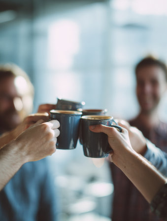 Group of friends joyfully toasting their coffee mugs in a bright, modern cafe with natural light streaming through large windows