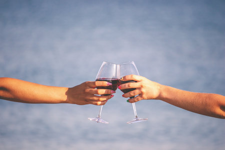 Group of friends toasting with red wine at beach, focus on hands