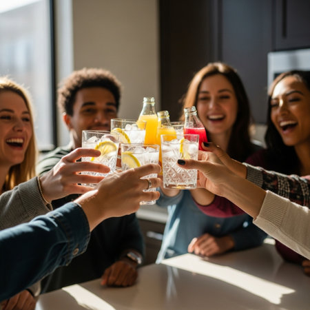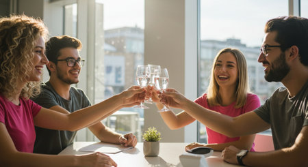 A lively group of friends raises their glasses filled with golden drinks, celebrating together in a warm, festive atmosphere. The scene radiates happiness and camaraderie, capturing the essence of joyful moments shared among close companions.