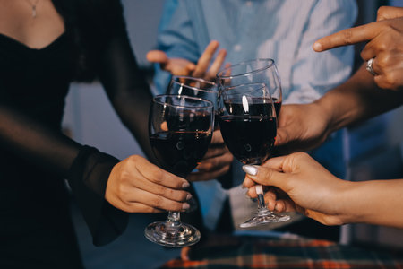 A sophisticated toast captured in a dimly lit setting, featuring two hands clinking wine glasses filled with red wine, symbolizing celebration and camaraderie.