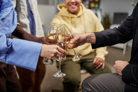 Hands of young multiracial friends clinking with flutes of sparkling champagne