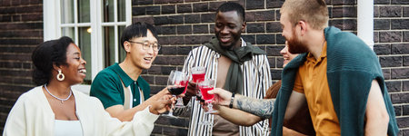 Multiethnic group of cheerful adult friends clinking glasses outdoors celebrating holidays at house party
