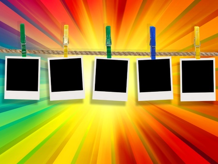 Blank Photos Hanging on Rope Against Multicolored Rays Background
