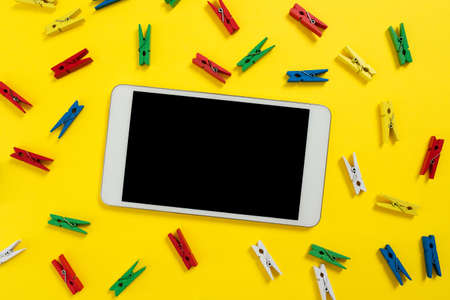 Colorful Pegs Placed Around Tablet Screen With Important Information. Wooden Clips Arranged All Over Cellphone Display With Crutial Idea. Pins With Critical Data Inside.