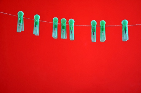 Plastic clothespins hanging on rope on a red background