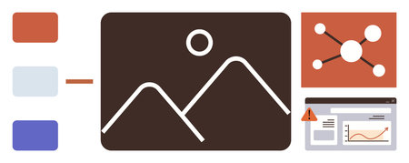 Abstract landscape in frame, data connections, web page with warning icon, and color palette samples. Ideal for web design, UI, UX, content management, creative workflow digital strategy simple