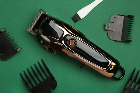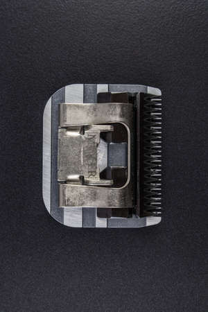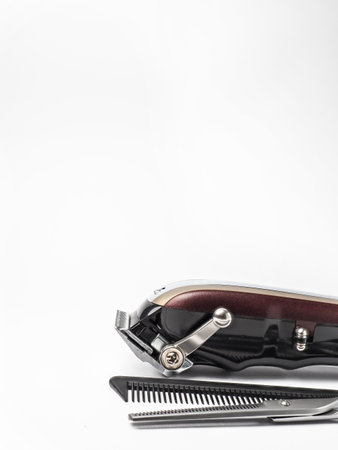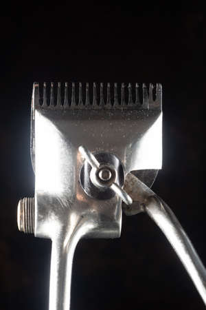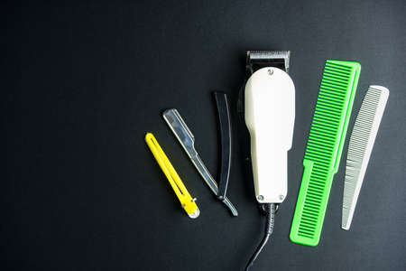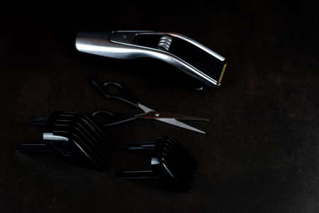 Stylish professional hairdresser hair clippers, hair clippers, accessories for haircuts on a black background