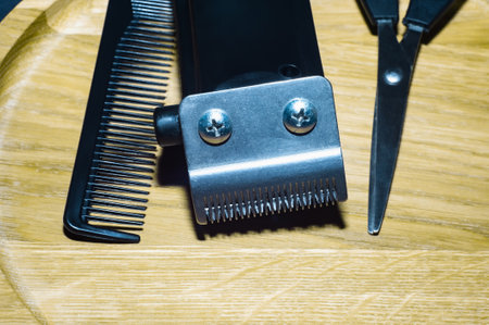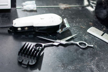 machine for haircuts. On the table are scissors and a comb. Barbershop. Hair clipper are on the table. Hairstyles Cut hair.