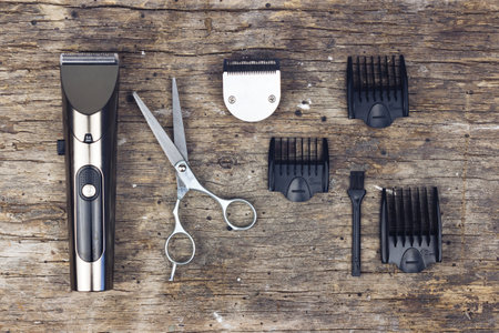 Barber electric machine, scissors and comb on a wooden background. A hair trimmer.