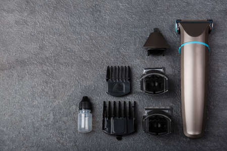 Male electric typewriter, trimmer, for cutting hair on a gray background, free space for text.