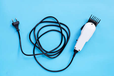 Hand holding Machine for hairstyle, Hair clippers on blue background. Barbershop. copy space