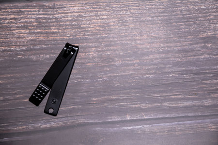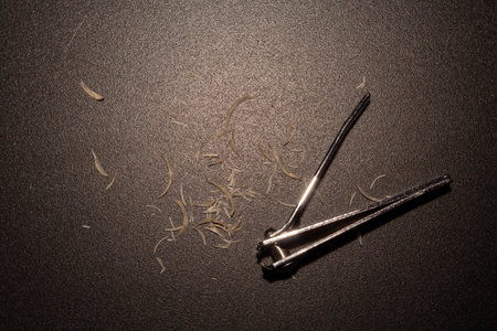 Cut fingernails and metal nail clippers on dark textured surface personal hygiene concept