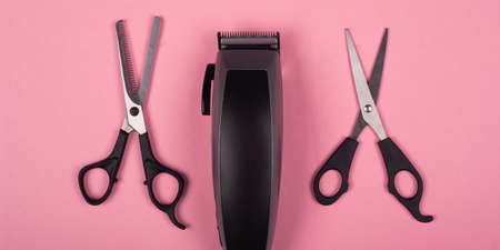 Hairdressing various accessories on a pink background. the concept of the hairdressing beauty industry. hairdressing scissors and hair clipper with attachments