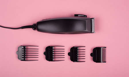 barber clipper for haircuts with nozzles of different sizes on a pink background top view.