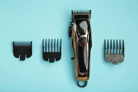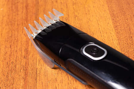 Machine for a hairstyle. Colors hair clipper on a light wooden background. Hair clipper with different nozzles and brush.