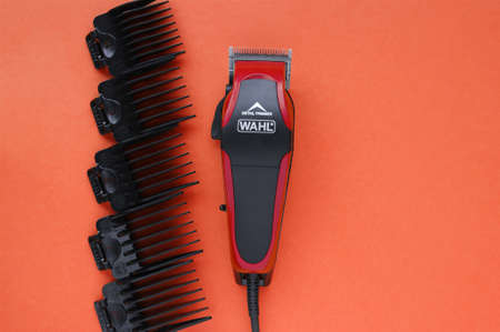 KHARKOV, UKRAINE - JULY 2, 2020: Hairdressers tool. Hair clipper WAHL close-up on a red background with nozzles of different sizes.