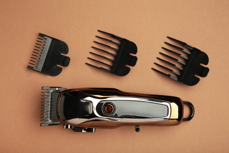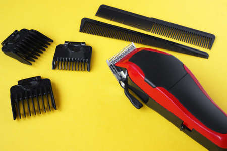 Hairdressers tool. Hair clipper close-up on a yellow background with nozzles of different sizes.