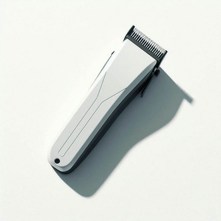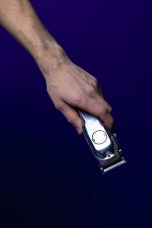 Had holding clipper tool under trendy color background with copy space and soft light. Stylish Professional Barber hair cut tools, Hairdresser salon concept, Haircut accessories.