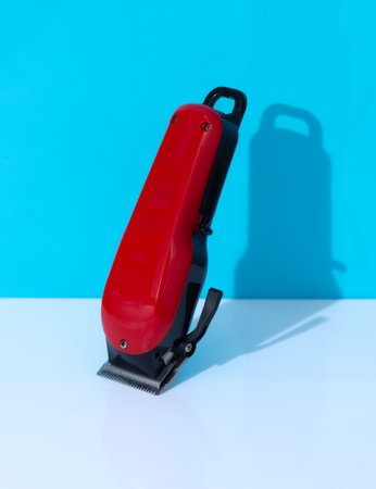 Machine for hairstyle. Barbershop. Hair clippers with nozzle on pink blue background.