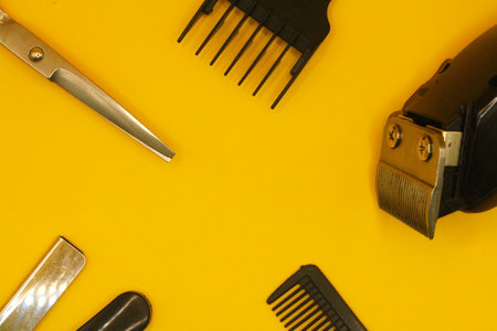 Machine for haircuts, scissors and comb on yellow background. Barbershop. hair clipper. top view. flat lay