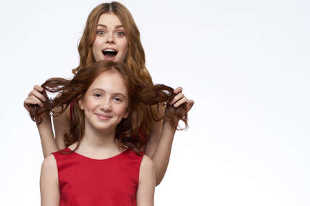 Mom and daughter stand side by side and fun family joy light background