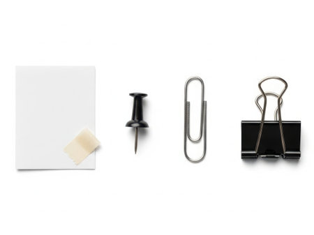 This image features a collection of office supplies isolated on a white background. The items include a blank sheet of paper with a piece of tape, a pushpin, a paperclip, and a binder clip. The items are neatly arranged and the white background provides a clean and minimalistic appearance.
