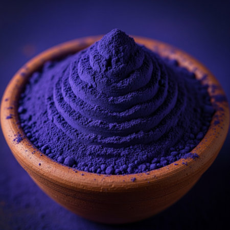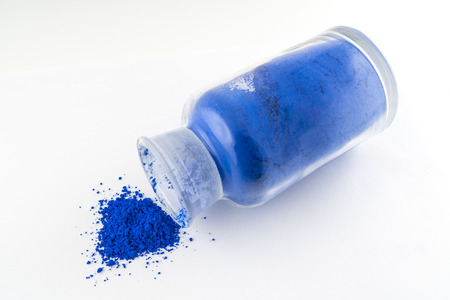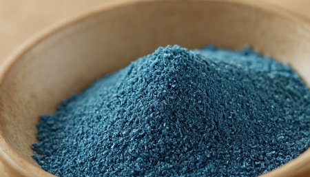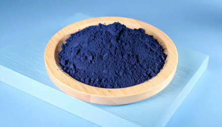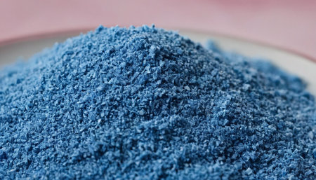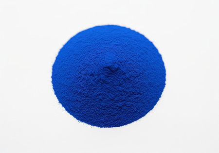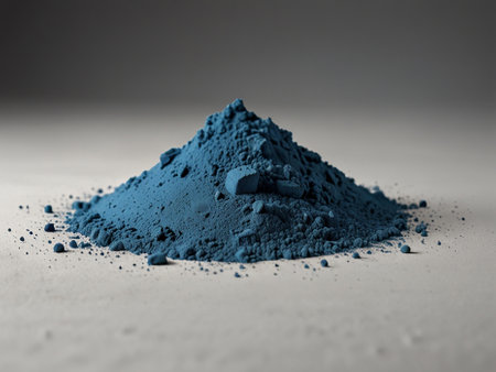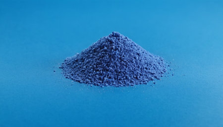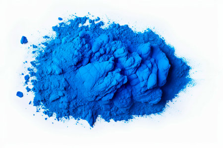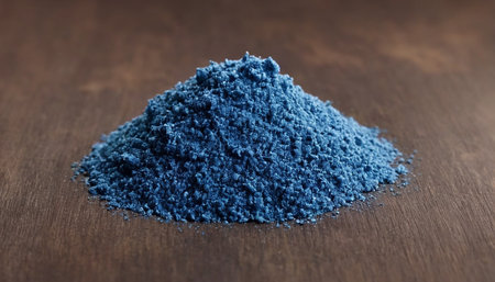 Blue pigment powder close-up. Macro shot of vibrant blue powder particles forming textured mounds on a dark surface with dramatic lighting.